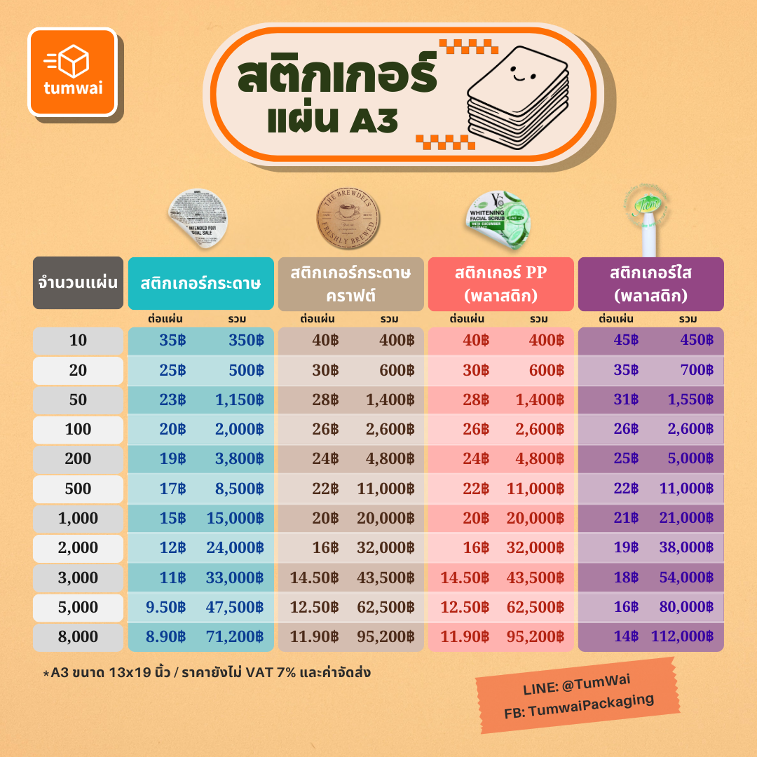 หมายเหตุ: ราคาสติกเกอร์ขึ้นอยู่กับ ขนาด, จำนวน, วัสดุ และเทคนิคการพิมพ์ กรุณาติดต่อเราเพื่อรับราคาที่เหมาะสมที่สุดสำหรับคุณ